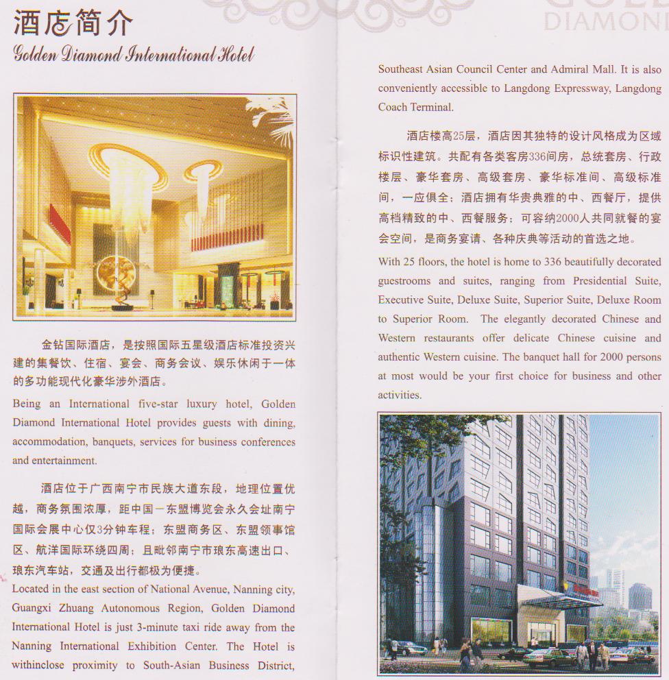 南宁金钻国际大酒店是一家集餐饮、住宿、宴会、商务会议、娱乐休闲于一体的多功能现代涉外酒店,酒店位于民族大道东段,距东盟国际会展中心仅3分钟车程,东盟商务区、东盟领带馆区,航洋国际环绕四周且毗邻南宁琅东高速出口、琅东汽车站、交通出行极为便捷。酒店楼高25层,拥有华贵典雅的中、西餐厅,提供高档精致的中、西餐厅,提供高档精致的中、西餐服务,可容纳2000人共同就餐。 .