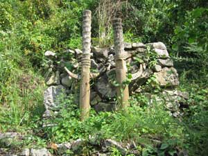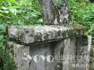 这座碑的造型刻得也比较普通,但是唯一值得阿裂感兴趣的是一个墓碑前立了一个圆形的石柱,石柱不高,但是从截面看是断开的,庆幸,在旁边看到了一根类似后来放牛头的天梯柱的半截石柱。从这里不难猜测出,或许在百年前的白裤瑶的前辈们是使用石柱的,到了今天,却变成了木头,令人匪夷所思啊!