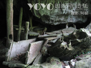 阿裂叙述说,岩洞里摆放着很多木棺材,很多都是用木架子支撑起来的,造型非常奇特。而有些因为风化或是被破坏散在地上,有些棺材是敞开着的,有许多尸骨露在外面。有些头颅被人为地摆放在棺材上面,看着就很阴森。