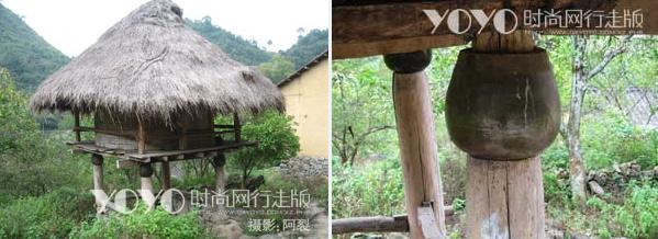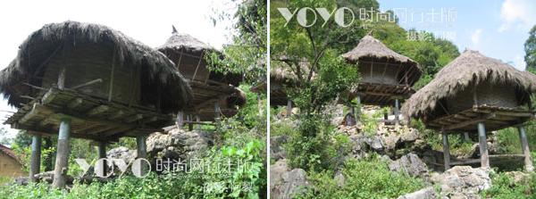 白裤瑶的粮仓搭建那可是一绝啊。粮仓多数是建在远离人居住的地方,一般有十几米远吧。这样就远离了火源,起点防火的作用。其次是悬空式的建筑,只用四根粗大的木柱支撑着,上面建成一个小房子似的,这样就可以防潮了。