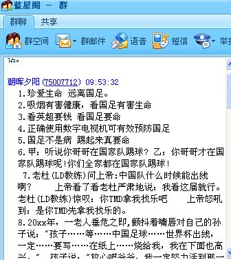 1.珍爱生命 远离国足。 2.吸烟有害健康,看国足有害生命 3.看英超要钱 看国足要命 4.正确使用数字电视机可有效预防国足 5.国足不是病 踢起来真要命 6.甲:听说你哥哥在国家队踢球? 乙:你哥哥才在国家队踢球呢!你们全家都在国家队踢球! 7.老杜(LD教练)问上帝:中国队什么时候能出线啊? 上帝看了看老杜严肃地说:我看这届就行。 老杜(LD教练)惊叹:你TMD拿我找乐吧 上帝怒吼到:是你TMD先拿我找乐的。 8.20xx年,一老人垂危之即,颤抖着嘴唇对自己的孙子说:"孩子……等……中国足球……世界杯出线,一定……要写……在纸上……烧给我,我在下面也高兴。" 孩子说:"放心吧爷爷,我一定努力活到那一天。"听完孙子的话爷爷满意的闭上了双眼.