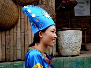 来到武鸣伊岭岩,步入"活"壮文化博物馆的壮乡民族风情长廊,身穿壮族服饰的导游穿着五彩的土布衣,带着壮族特有的头饰,显得特别美丽。刚进了壮乡民族风情长廊就有土生土长的壮家人吹