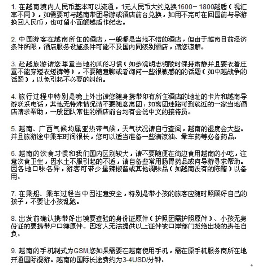 十、游客在越南旅游期间不要单独行动,在自由活动时间内必须结伴同行;