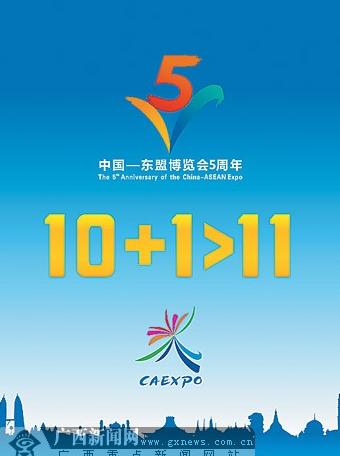 据介绍,中国-东盟博览会5周年标志和宣传画,是从众多投稿中精选出来,并经过严格修改完善后确定的。博览会5周年标志由“5”和“V”组成。“V”由博览会会徽中的两叶花瓣组成,既是罗马数字中的“5”,同时又是英文Victory(胜利)中的第一个字母,寓意中国-东盟博览会5年来取得的辉煌成就。“10+1>11”宣传画,简明深刻地概括了中国-东盟博览会的意义、作用,以及跨越11国的广阔市场和巨大商机。