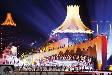 昨晚,一阵阵激昂的音乐从民歌广场传出,在不断变换的灯光的映照下,一朵朵大大小小、高低错落分布在舞台和灯光台架上的朱槿花造型晶莹透亮,数百名舞蹈演员们在流光溢彩的舞台上、“梯田”上,进行着苗族大歌的舞蹈实地整合排练(见图)。据了解,今年的民歌艺术节晚会民族大歌,将有壮族、苗族、瑶族等少数民族轮番上场,其舞蹈也是整台民歌节晚会最为精彩的部分之一。