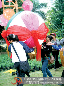 11月26日上午,在南宁市民族滨湖路口的绿化带,南宁市狮山公园的工作人员正在布置造型,草地上放着绣球、木桶、工艺伞等物品。6名工作人员抬起一个巨大的绣球高举过头,在听从一名领导的指挥,一点点地调整位置。现场却不见该领导的影子。一名工作人员笑说,领导用电话来遥控工作,也许就在过马路的人群中,“我们也不知她在哪里”。