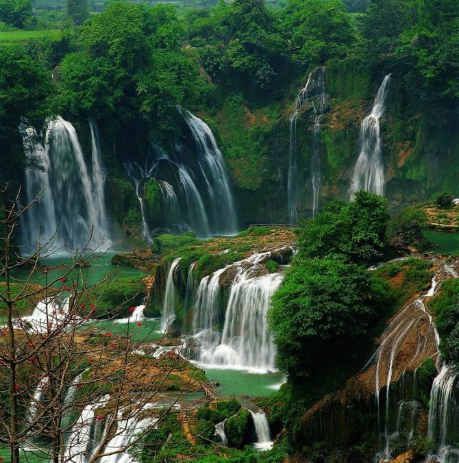大新景点简介:有着亚洲第一跨国大瀑布之称的德天瀑布景区,四周古木参天,瀑布由高低不齐、大小不一的湍流穿过丛林直落而下,呈三级跌落,景区内有53号国界碑。归春河对岸就是越南,常可见越南边民与靖西村民交易的情景。
