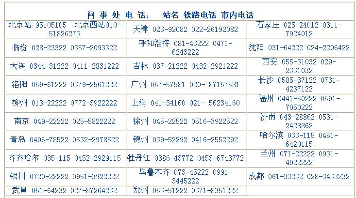 北京站 95105105 北京西站010-51826273 天津 023-92082 022-26192082 石家庄 025-24012 0311-7924012