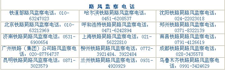 北京铁路局路风监察电话:010-63212969 呼和浩特铁路局路风监察电话:0471-6242894 郑州铁路局路风监察电话:0371-8322139