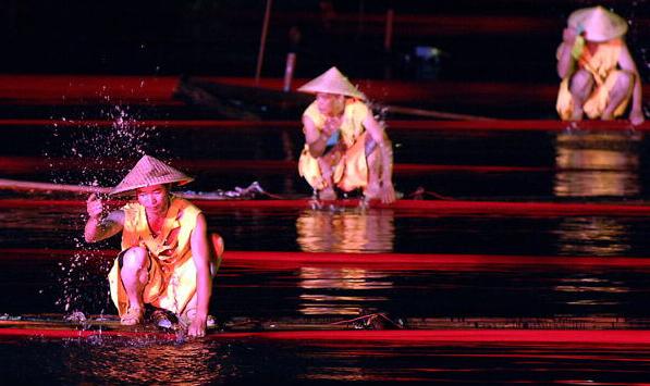 《印象·刘三姐》以桂林阳朔方圆两公里的漓江水域为舞台,以12座山峰和广袤天穹为背景,将壮族歌仙刘三姐的山歌、广西少数民族风情、漓江渔火等多种元素创新组合,融入桂林山水之中,诠释了人和自然的和谐关系。全场演出超过70分钟,演出人员超过700人,其中三分之二是当地渔民等非专业演员,整个演出如梦如诗、气势恢宏。新华社记者 章磊摄