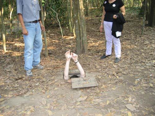大年初二,导游带我们一行十人奔赴昔日战地-古芝地道,然后转站战争博物馆(War Remnants Museum)。古芝地道最早建于1948年,当时是为抵抗法国。当年用简单的铲子挖了二十年才完成,到了六十年代末成为抗美根据地。地道共分三层,设有厨房,休息室,会议室,粮仓,甚至洞房。第一层离地面最近,人尚可行走,可连接到西贡河口,从海路逃走。第二层人需弯腰行走,最深的第三层需蹲着或爬行才能前进。洞口非常小,只有肩膀宽,需要把手臂向上举起才可进去,然后避免暴露,还要先把洞口掩护好,再下到伸手不见五指的地道里。古芝展区还展示了很多当地特产的制作过程-比如春卷皮和轮胎鞋。还有很多当年战争时期做的武器,陷阱和地雷区的样本。可以想象当时战争的残酷和血腥。然后穿有绿色军装的士兵作导游,带我们在一段三十米长,一米多高的地道里亲身体验地道行走之艰难。因为本人个子较高,又背了一个装着D80的双肩包,几乎如武二郎扮演武大郎般在黑暗曲折不平的地道里蹲行了十分钟,上来后大腿就不会打弯了,只能做直线运动。古芝距西贡大约有两个小时的车程,中午回到西贡用餐,然后参观战争博物馆。战争博物馆的前身是美军情报中心,展区分我室内与室外两大部分-室外是展示美军越战时使用的飞机,坦克和毒气弹,还有一个监狱和断头台。室内是图片与文字还描述当时战争的残忍。多是揭露当时美军用先进武器和化学武器的罪行。可笑的是,这些罪行多是当年美国媒体作为战绩的炫耀。参观后,我无限感恩,祈求今生平安终老,无需经历任何战争及苦难。