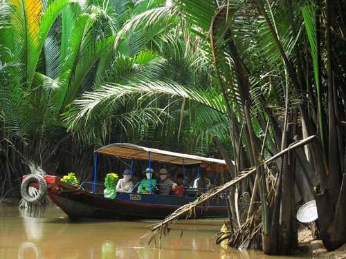 第三天的主要活动是畅游湄公河。一个半多小时的车程后,我们来到美托小镇(My Tho)。转上一个机动小艇,乘风破浪,带我们到一小岛。先是参观椰子糖工场,观看整个制作过程,品尝最新鲜的椰子糖,然后穿过一片卖手工艺品的绿地,坐在茅屋下,边吃当地特色水果(火龙果,椰子,菠萝),边欣赏几个越南美女和小孩唱歌。走过一片果林,是一个养蜂区。这里有一只超大猛蛇,团里几个猛男都把它缠在身上照相。我们品尝了蜂蜜水,蜂王浆和一种药酒。还有卖蝎子酒,据说对男人超补,玻璃酒瓶里一只黄玛瑙色的大蝎子直立其中。再往前,就是我们此行的重头戏-乘舟畅游湄公河。船很小,一次最多坐四个游客,有两个掌舵的,一前一后。我们一人发一个越南特色的斗笠,在狭小丛林的巷道中穿行。很难想象这么狭窄的水道居然可以有三条船并排同时划行。凉风习习,河周围的芦苇郁郁葱葱,真是心旷神怡。午餐在泰山岛上,绝对不容错过的是象耳鱼和恐龙蛋。象耳鱼是一种长的像大象耳朵的鱼。它整个被炸了后,就直立地被摆上桌来。然后由服务生示范吃法。它是跟菜一起包在春卷中食用。恐龙蛋是用糯米做的一个篮球大的空心蛋,味道微甜,很不错的小吃。用餐的餐馆很美,好像在一个大花园里。小桥流水,绿草成荫。