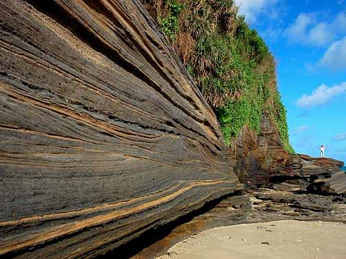 在这样的山岩上行走,确实不是一件容易的事情,就好比在拆迁后的瓦砾中穿行,你既要留意不错过眼前的美景,又得当心不要掉入那深深浅浅、大小不一的洞穴;有时,道路狭窄到只能侧着身子从崖壁下通过,到近前才发现,一株生命力极强的仙人掌由崖上伸向天空,“逼迫”得我们只能再低着头小心通过。在过后的一片沙滩上停下来,从脚底传递而来的却不是松软的感觉,而是可以带来更多理性的稳健。我望着大海,望着那些山岩,忍不住又走到崖边,或是蹲下身子,抚摸这些粗糙的地表皮肤,这似乎是此时我能想到的、亲近大自然的最好方式,它们曾经是那样的火热、滚烫,可现在也都被岁月带走了内在的温度,只剩下太阳照射下表面的一点温暖了。你可以嘲笑它们是没有任何生命力的一堆石头,然而,三万年后,它们依旧还在这里,经受住了岁月的洗礼;在这其间,又有多少曾经无比鲜活的生命了无尘迹了呢?