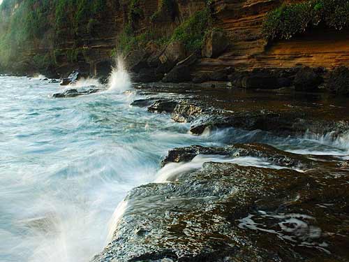 岛上专门为游客开辟了火山口遗迹公园,将大量海蚀遗迹保护起来,呈现在游客面前。沿着木阶梯下到海边,眼前的景观令人咋舌:数十尺高的悬崖下,千疮百孔的赭红色的火山岩交叠在一起,其间有许多火山洞穴,远远望去像是在海边架起的一座巨大的迷宫,迷宫下就是更加谜一般的大海。
