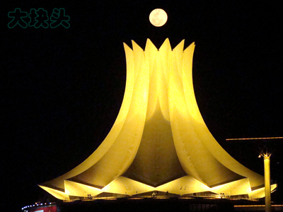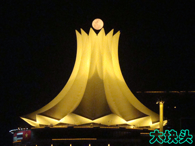 这次去南宁,还有一大收获,就是拍了几张我认为比较好的南宁夜景照片——南宁国际会展中心那座花型的巨大建筑物,我照过很多次,但这次,到那里时,正是晚上7点50几分,一轮大大的月亮,居然就升起在花心处附近!我先是照了几张在旁边的,后来灵机一动,自己调整一下位置,让月亮正好升到花心处不是更好吗?于是,就有了下面这几张照片。本想用PHOTOSHOP调整一下对比度,但发现一调,月亮里的纹路就不见了,于是决定不作任何调整,原汁原味地放上来。