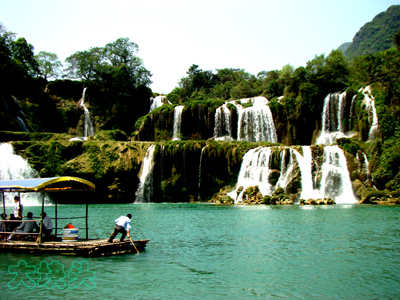 与大家一商量,伍部长、张部长都赞同,没有人反对,于是,走!一切按计划实现。我和张部长两人轮流开车,他开去德天花了约五个小时,问了几次路,还走错了一次路,大约十来公里,一来一回就去了约20分钟。在德天呆了两个半小时,果然名不虚传,大开眼界。而且,现在不是丰水季节,瀑布不太大,但游客也不多,约三四百人,很好拍照。玩耍的效率也相当高。中国和越南,就以这条大瀑布群流出来的一条河为国界,延续了相当长,河两岸这头是中国,那头是越南。瀑布的上游,有一个53号界碑,但我们走到那里时,却不开放,说是两国又为一些纠纷有矛盾了,为了游人的安全所以暂不开放,但卖越南香烟、香水和牛角饰物等等的中国本地人、越南人却是可以自由出入的。我们的乘船在河中游玩,都划到对岸的岸边了,问能不能上岸,回答说可以,但要准备大约6000元钱的罚款,还要准备被关上四五天,吓得我们没敢再多嘴,只有赶紧拍照。