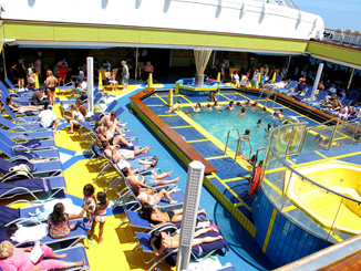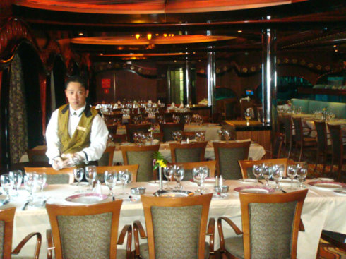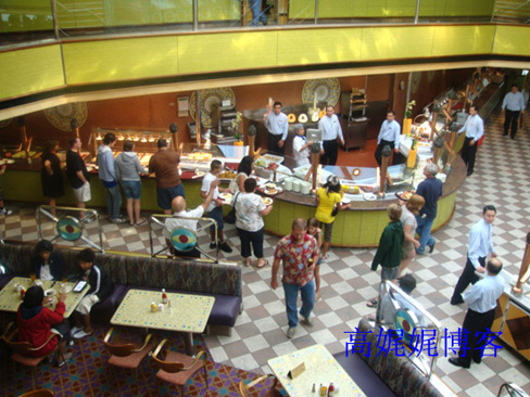 吃饭分几种,一种是在船顶层的自助餐,24小时开放,吃什么任你选,吃这种自助餐时,对你的穿着是没有要求,就是穿着比基尼,都可以。所有的费用全部包括在你买的船票里,就是说,一上了船,你可以不再花钱。