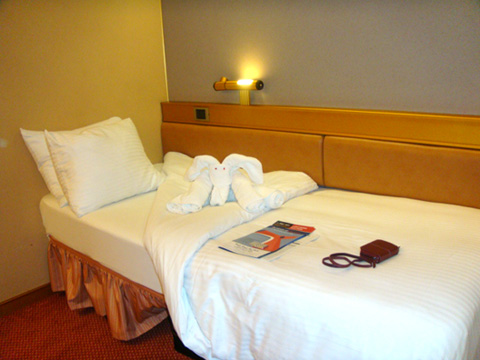 船上的房间是这样的,我把一个大床分成2个小床,不过,好像那几天很忙,在床上的时间很少