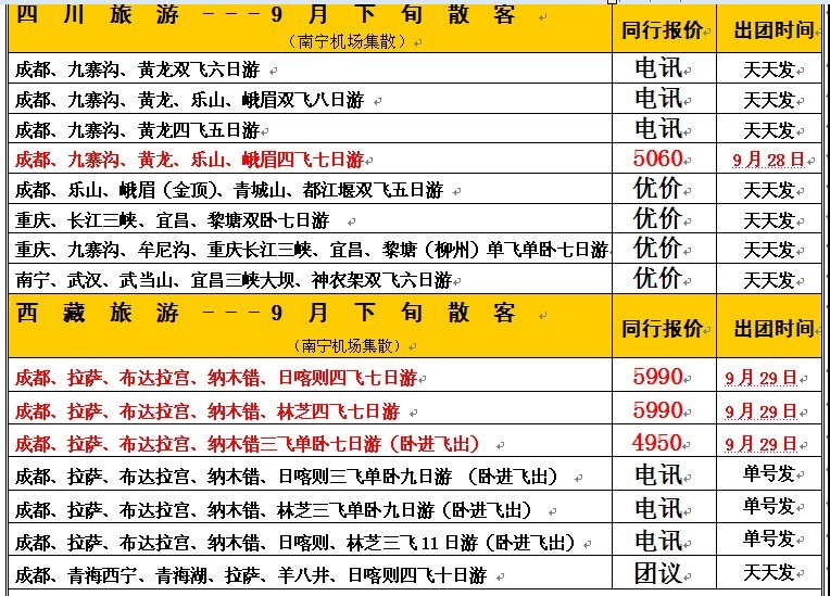 备注:由于九寨飞机团,此期间为负团费操作,如遇85后加100元/人,90后加200元/人。65岁以上老年人加100/人。 接待标准: 1、交通:南宁/成都往返机票及燃油机建费、成都/九寨沟往返机票及燃油机建费,陆地交通空调旅游车; 2、用餐:6早6正(正餐八菜一汤,十人一桌); 3、住宿:成都、峨眉为普通双人标准客房,九寨沟为空调双人标准客房; (如产生单房差,房费由客人自理;峨眉、沟口晚餐须在所住酒店用餐,不吃不退餐费) 4、门票:行程所含景点大门票; 5、导服:地接导游服务; 友情提示:不含航空保险。请组团社为游客购买旅游意外伤害保险。 注意事项: 1、旅游线路山路较多,只适用于底盘较高的国产空调车,故空调、座位间隔可能未如理想,但保证每人有一个正座。因车辆长时间行驶在高原地区,空气稀薄行驶比较吃力,发动机长时间高速运较,有可能会遇到汽车抛锚并影响行程的情况,请游客做好心理准备。 2、入住酒店时请不要拥挤抢房牌,配合导游工作,导游会尽可能合理的分配房间;入住后请注意检查房内设及阅读酒店须知,损坏酒店物品要照价赔偿。晚间外出自由活动时请向酒店总台领取酒店卡片,询问酒店、导游了解当地情况,避免出现不必要的损失。团队行程中出现住房单男单女,导游有权拆分夫妻房或由客人自理单间房差或安排3人间。因九寨沟里打造绿色品牌所以酒店均不提供洗涮用品,请带好洗涮用品! 3、由于九寨沟沿线气候、环保及当地山里条件有限原因,大部分酒店不装空调或装了空调不开均属于正常现象(空调和热水限时供应一般是21:00-00:00)。另外进入九寨沟藏族地区,在软件服务质量及餐饮质量上都不能与内陆相比,我们会尽量安排在同等标准中较好的服务。客人可携带一些方便又宜饱肚子的食品。因九寨沟是少数民族集居地,饮食习惯不同,食物制作和口味也不同,早餐较简单,所以请各位贵宾作好心里准备。异地旅游用餐,较易引至水土不服,请游客自备常用药品。 4、如行程有自由活动,自由活动期间请务必注意交通安全。行程过程中一定要注意自身健康安全,不要乱吃不洁净的食物,不要去逗引动物,以免被抓伤。请遵循宾馆所规定的退房时间来退房,如不按时退房者所产生的费用自理。 5、因不可抗拒的因素造成的团体滞留及产生的费用由客人自理(如飞机、火车延误、交通事故、自然灾害、社会因素等),及因人力不可抗拒因素造成景点不能游览,我社只负责退还门票,不承担由此造成的损失,如自愿放弃当地景点、用餐、住宿等,其费用我社均不退还。我社在保证不减少景点不降低接待标准的前提下,保留将全程线路进行调整的权利。 6、为维护消费者的合法权益,报名时将签订旅游组团标准合同。 7、交通票以交通部门售于旅行社的车次时间为准。若出团前退团,则按照旅行社标准合同中条款执行。 8、请客人适当携带随身物品如:巧克力、肠胃药、阿斯匹林、防晒霜、太阳伞等。当地酒店及餐饮条件与广西地区有一定差距,请团友予以谅解。 此行程非纯玩行程、行程中均有旅游定点商场参观,不强制购物、敬请配合! 组团旅行社: 地接接待旅行社:
