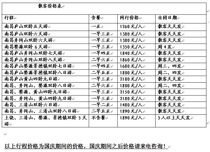 南宁、南昌、庐山双卧六日游 天 数 行 程 用 餐 住 宿 第一天 南宁(18:50分)乘火车赴南昌。 火车上 第二天 16:01分抵达南昌,入住酒店,晚上自由逛胜利步行街,品尝江西特色小吃! 南 昌 第三天 早7:00指定地点集合出发,BUS赴自古有“匡庐奇秀甲天下”之誉的世界文化遗产—— 庐山180元(102公里高速,28公里盘山公路,车程约2.5小时),观老别墅的故事(自理30元/人1个小时),外观开过三次重大会议会址(15分钟不入内),游含鄱口(30分钟)此处湖光山色,可观中国第一大淡水湖鄱阳湖,庐山最高峰大汉阳峰,游庐山落差最大、最壮观瀑布三叠泉(51/人自理2小时30分), 中晚庐山 第四天 早游白居易所题“人间四月芳菲尽,山寺桃花始盛开”花径(15分钟),游走全长1452米,庐山最美丽的峡谷、因四季花开灿若锦锈锦绣谷(总路线1小时20分)、神龙巧救朱元璋【天桥】、更有天生一个仙人洞、无限风光在险峰,庐山山上寺庙黄龙寺(10分钟)、游三宝树(5分钟)、庐山恋取景地黄龙潭(10分钟)、西游记水帘洞取景地乌龙潭(5分钟)游览庐山第一景石门涧(52元自理,星龙索道单下30元/人自理)电站大坝、列宁石、悬索桥、铁船峰、世界地质公园、U型谷等,返回南昌,参观全家红厨具展示中心(40分钟)结束愉快的红色之旅! 早中 南昌 第五天 自由活动,下午乘(17:27分)1557次火车返南宁。 火车上 第六天 13:22分抵南宁,结束愉快行程! 报 价 元/人 服务标准 1、 交通:旅游空调车、景区观光车 2、住宿:普通经济双人标准间,出现单人补房差 3、用餐:一早三正(十人一桌、八菜一汤) 4、门票:庐山进山大门票 5、导服:优秀导游服务 6、保险:旅行社责任险 特别说明 1、景点不减少的情况下我社保留调整游览顺序的权利;因人力不可抗拒因素我社不承担赔偿责任。 2、收客前请来电咨询确认,旅游期间对我社接待质量未提出疑议,我社视为满意,具备门票优惠政策的游客请带好有效证件,我社只退还门票折扣差价,当时未出示证件的我社不负任何责任。 3、如团队产生单男单女,用三人房或调整夫妻房,或由客人自行补足房差; 全程购物店2个 参观全家红厨具展示中心(40分钟) 自费项目 老别墅故事30元/人、石门涧52元/人、星龙索道单下30元/人、三叠泉65元/人、三叠泉索道往返80元/人 各景点游览时间 含鄱口半个小时,三叠泉3个小时。花径20分钟,锦绣谷、天桥、仙人洞、险峰全线一 个半小时,老别墅故事半个小时,黄龙寺、三宝树、黄龙潭、乌龙潭全线一个小时,外观 会址20分钟