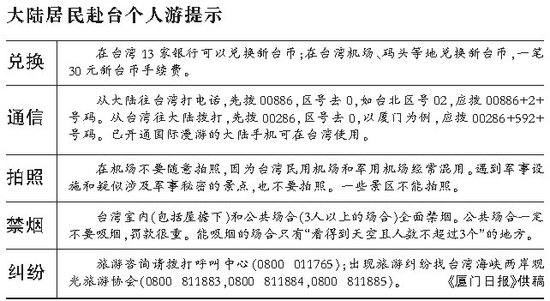 收益:据台方测算,截至今年3月,大陆居民赴台旅游已给台湾带去32.47亿美元收益。