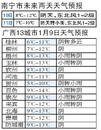 湿冷天昨日再现。今天,百色、崇左、河池、柳州、桂林等市阴天大部有小雨,我区其它地区阴天有分散小雨。10日,桂北阴天部分地区有小雨,桂南以阴天为主。