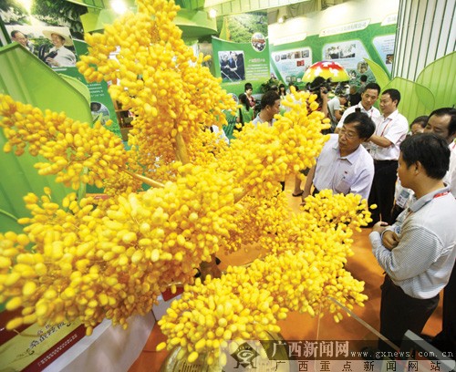 在广西农业厅展厅里,一棵金灿灿的“金蚕树”引人驻足。这棵“金蚕树”是由9999颗天然彩色蚕茧制作而成的,“蚕蛹已经抽出来了,味道和颜色都是蚕茧原本的样子。这样一个蚕茧拉出的蚕丝最长有900米到1000米。”广西蚕业技术推广总站的农艺师黄文功介绍说,这种天然彩色蚕茧今年刚通过广西农作物产品鉴定,第一次在展会上亮相。