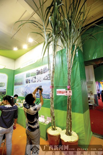 叶子已经碰到天花板的甘蔗出现在广西农业厅展厅里。农业厅的工作人员介绍说,这最新研发的甘蔗品种高有3米左右,很受广西蔗农的欢迎,通过本次博览会的平台把新品种进行推广。