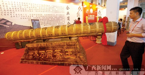 而茶叶展区里,像一门大炮似的“世界万两茶王”让不少市民惊叹,参展商湖南久扬茶叶有限公司的负责人说,湖南安化黑茶的制作工艺已经被列入国家非物质文化遗产,这次带来的“万两茶王”产于2009年,相当于362.5公斤,单是包装都要21个工人花费3天的时间才能完成,现在市面价值68万元。