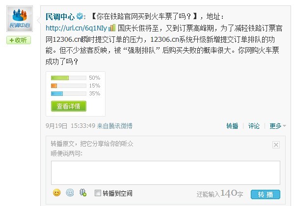【你在铁路官网买到火车票了吗?】,地址:http://url.cn/6q1NIy 国庆长假将至,又到订票高峰期,为了减轻铁路订票官网12306.cn瞬时提交订单的压力,12306.cn系统升级新增提交订单排队的功能。但不少旅客反映,被“强制排队”后购买失败的概率很大。你网购火车票成功了吗?收起你在铁路官网买到火车票了吗?