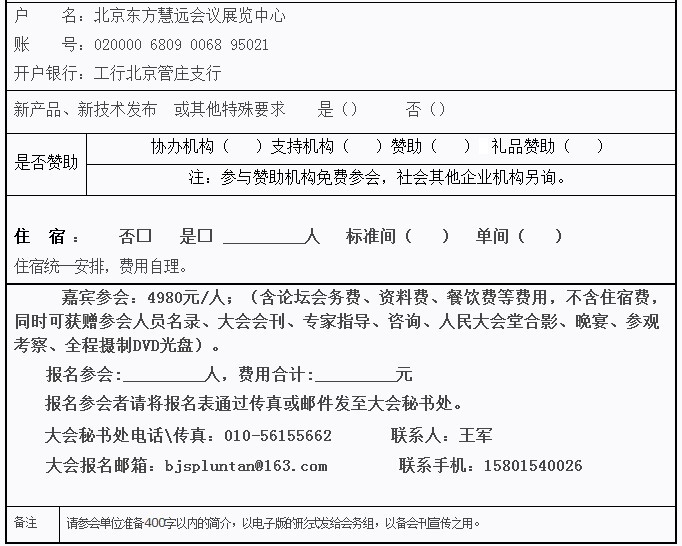 大会秘书处电话\传真:010- 56155662 联系人:王 军