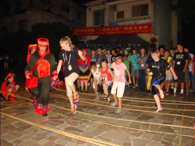 在村民带领下学习跳竹竿舞